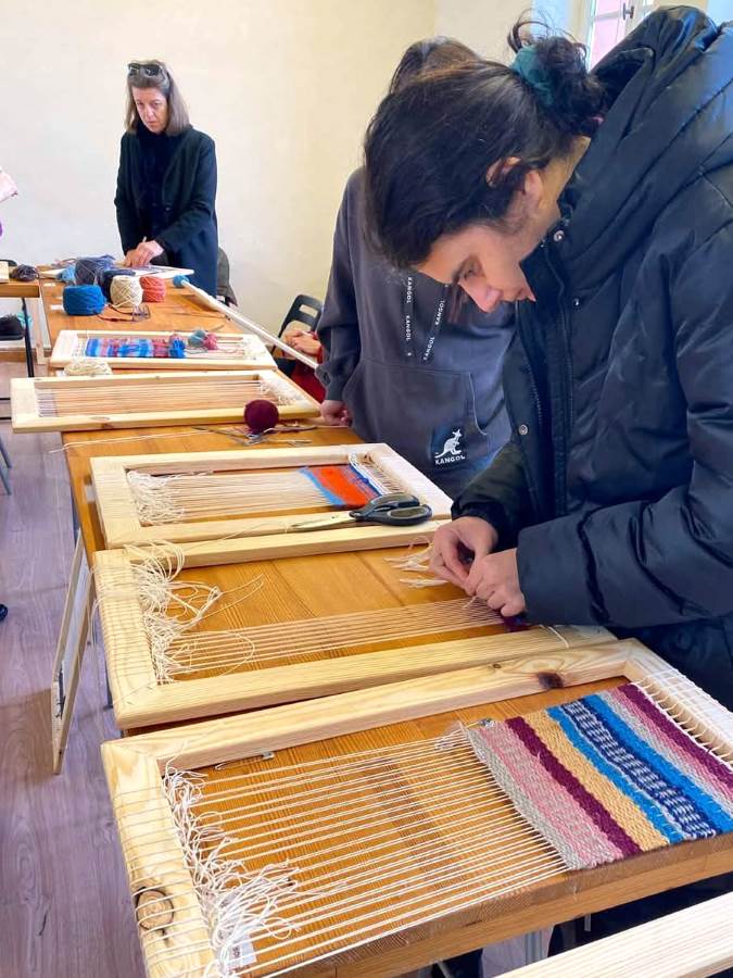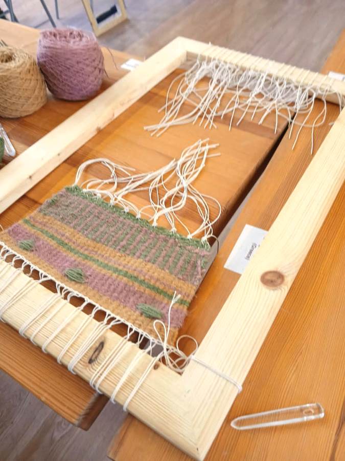Παράλληλα, ένας πτυσσόμενος αργαλειός έδωσε τη δυνατότητα σε όλους να πειραματιστούν και να πάρουν μια πρώτη, βιωματική γεύση της τέχνης. Τη Δευτέρα και την Τρίτη πραγματοποιήθηκαν εργαστήρια ύφανσης σε τελάρα, επιτρέποντας σε περισσότερους συμμετέχοντες να δημιουργήσουν το δικό τους έργο. Τα υλικά που χρησιμοποιήθηκαν ήταν μαλλί Ηπείρου από το Pokari, βαμβάκι για στημόνι και κουρέλια που οι ίδιοι οι συμμετέχοντες έμαθαν να κόβουν από παλιά ρούχα, δίνοντας νέα ζωή σε ξεχασμένα υφάσματα.